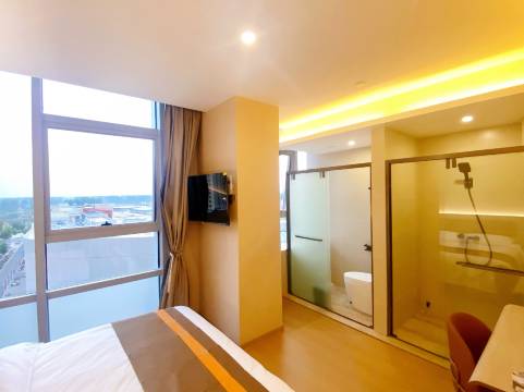房间干净整洁,装修简约时尚,卫生间干湿分离,房间配备智能语音助手,还有小零食,非常不错的住宿体验👍👍👍