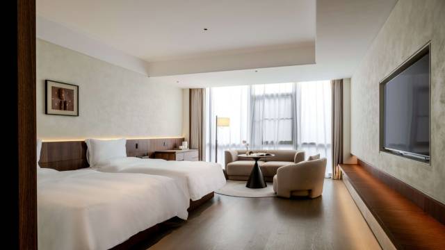 第一次入住光谷曲水的客房,在附近出差偶然看到的。没住过,想过来试试。听前台的工作人员介绍客房最近才开始出售的。那我得好好得评价一下了,首先门口有门童带我进大厅。整个大厅得装修风格很像博物馆得感觉。老板美学品味造诣不浅啊!其次是前台办理入住的速度还挺快的,还顺带介绍了酒店的洗浴消费,有洗澡做项目免餐费的,还有直接做项目的。选择还挺多。办理完了从大厅到住房楼层,一直都有人接待,拿行李。进了客房后,服务员把客房的设施设备都介绍了一遍,房间新装修的,没有装修味道。房间淋浴间干湿分离,迷你吧是免费使用的,里面配了NFC的果汁,桌面上摆放的都是玻璃包装的瓶装水。牌子有点不熟悉,特意网上搜索了一下,新西兰的兰维乐,均价20+一瓶。入住后服务员会送欢迎水果,我觉得这点挺好的。水果很新鲜,品质非常不错!房间含双早,早上8点有事情要办理,7点过一点我就到餐厅了。服务员精神很饱满,热情问好。有凉菜、热菜、面食、水果等。我最满意的点就是这里有现磨热咖啡机,这简直是我们这种商务人士的福音。一整套体验下来,个人感觉这个价位还是非常值得的。这次行程太赶了,不然我非得体验一下曲水的水疗。等下次有机会吧。这家酒店毫无疑问先收藏了。