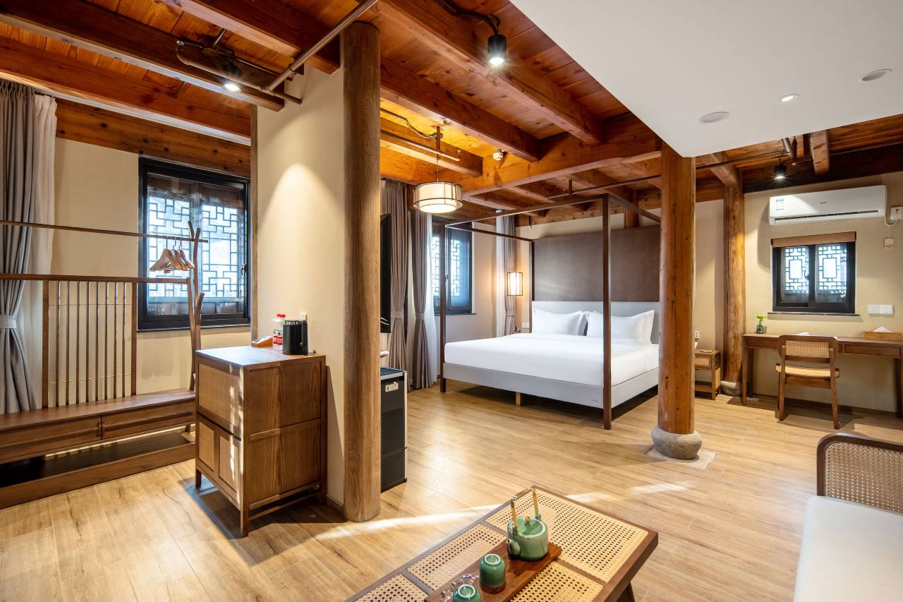 客栈座落在朝阳桥和费家桥的交界处,独立的客栈观景平台,可以寻找到别样的古镇视角,同时又拥有宽敞舒适的室内活动空间,满足不同家庭的的休闲需要。