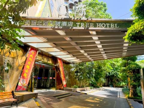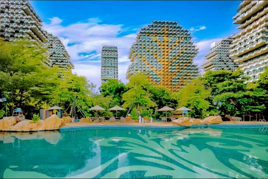 欢迎入住三亚地标建筑大树酒店,酒店内共有九栋大楼围绕梧桐树造型独立打造,造型优美,环境非常不错。