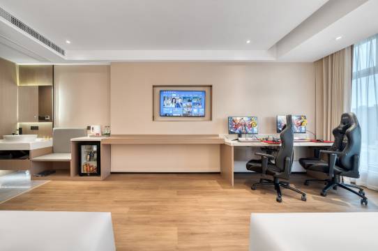 干净卫生,最主要是位置好,楼下就是商场,前台小姐姐服务特别好。还可以打打游戏。网速特别快。设施都是新装修的。下次还来