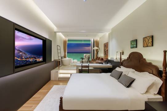 房间阳台落地玻璃将碧海蓝天框成流动油画,清晨推开阳台隔音玻璃门浪声轻柔唤醒一整天。设计简约温馨,床品柔软得像陷进云里露台浴缸泡澡看日落堪称一绝。