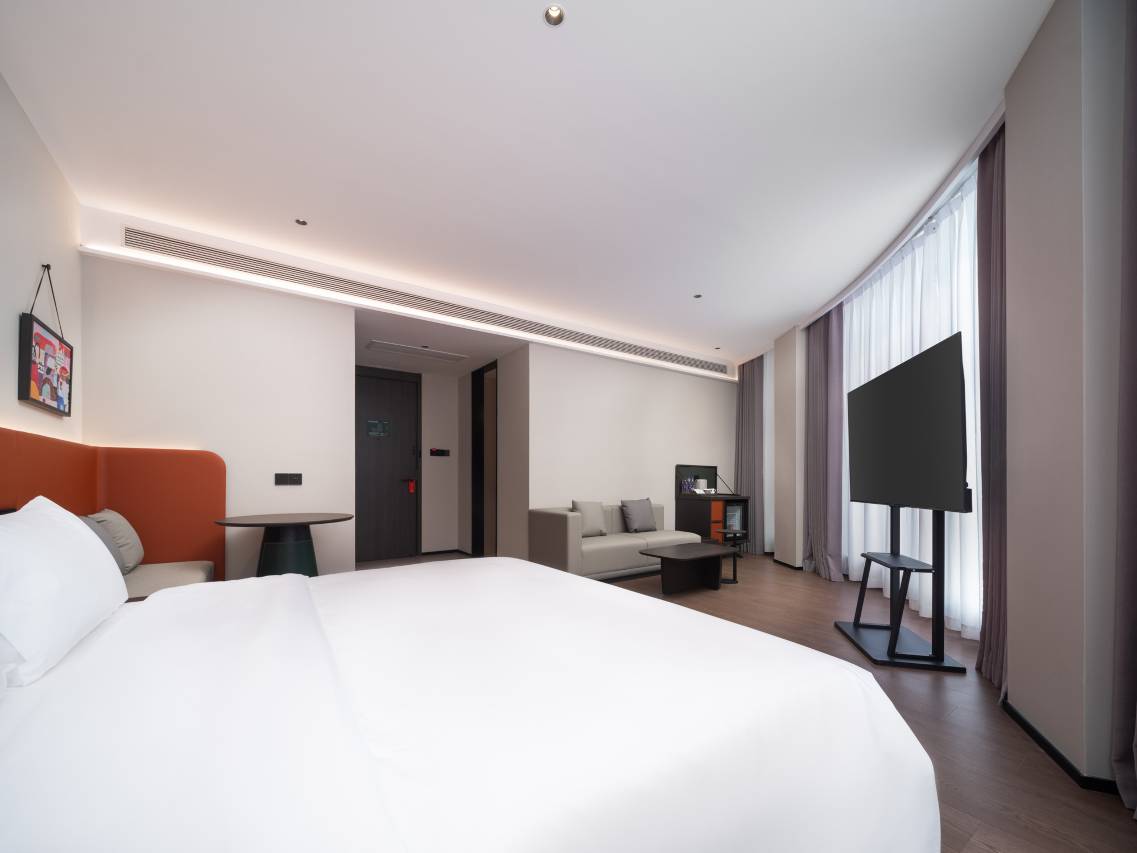 欢桔是以“年轻、分享、向上”为品牌理念打造的 年轻新商旅酒店品牌,它将旅行、社交和轻商务等元素融合, 以咖啡文化为设计核心,不论是你商务出行还是休闲娱乐, 在这里都能享受到与众不同的旅居体验。酒店大厅备有欢迎茶水、会员咖啡和自助茶歇、机器人取物送物、24小时自助健身房、智能洗衣机、烘干机、自助挂烫机、免费停车场;房间内:中央空调、电动窗帘、智能马桶、恒温热水、雅兰高织高密床品、雅兰0压枕、品牌安町洗护、梦百合0压加厚床垫;自助餐厅提供多种菜式,包括冷菜、热菜、主食、甜点、饮料等,满足不同口味需求;该酒店拥有宽敞的多功能会议厅,是举办会议、会展等各项活动的理想场所,多功能会议厅可进行多样化的个性布置,该厅还匹配了先进的音响设备,为活动提供高质量的效果。