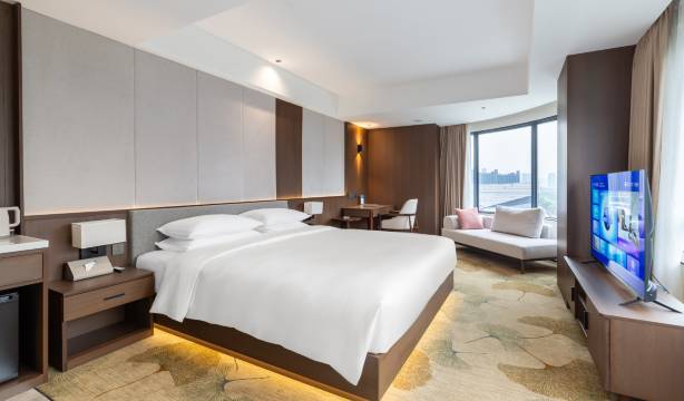 我们入住的御景大床房面积宽敞,落地窗正对中心湖景,白天波光粼粼,晚上还能欣赏音乐喷泉夜景,视野绝佳。房间面积在35㎡以上,布局合理,干湿分离的卫生间设计也很贴心。酒店位置极佳,步行几分钟就能到达金湾华发商都和金湾艺术中心,购物、看展或散步都非常方便。