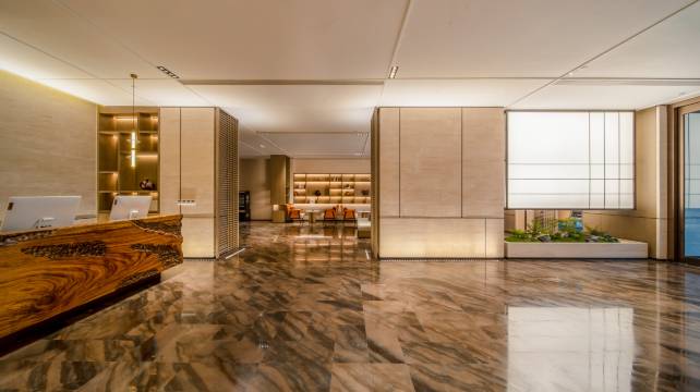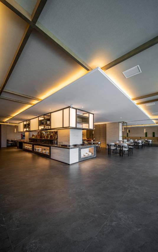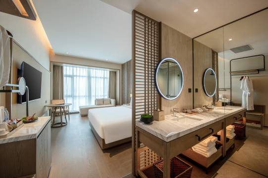 酒店运用东方、自然、多元的空间设计手法,通过空间关系处理、材料运用和艺术串联让人与酒店多维度产生链接。如果说公区系统是在多维度地回应东方、自然、地域的关系。客房系统则是宁静内敛的、质朴的,有时间感的。客房整体颜色温润,自然,让入住客人沉浸式体验到自然舒适的随性之旅。