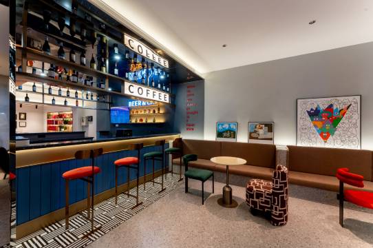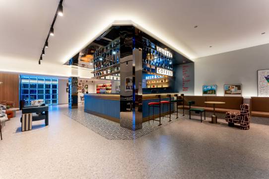 🌟这家酒店的外观设计很有现代感,橙色与黑色的搭配显得格外醒目✨。一进大堂就被那面蓝色发光墙吸引,科技感十足💡。休息区布置温馨,茶水台整洁有序🍵。服务人员态度友好,入住体验流畅😌。整体环境干净舒适,细节处理到位👍。