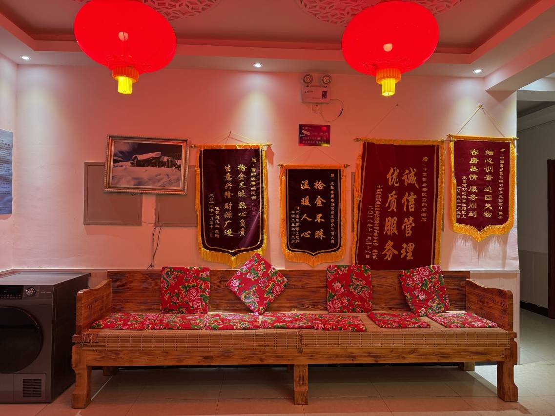 服务很好,房间里面是花花的东北大花风格很喜庆,炕挺大的,比大床大多了,住人可以各种翻滚,早餐很好,雪乡很美,美丽动人。