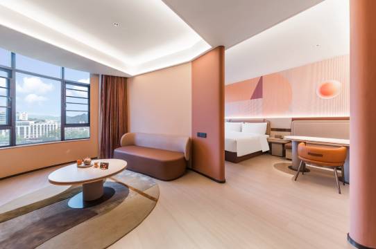 新开业的酒店设施很新,跟房间设施和官网图片上一样,桔色酒店的装修风格,性价比高。房间打扫的干净,能看见江景,虽然临街晚上不吵,睡得很好。前台的小美女们态度好,热情礼貌。就是给分配房间里有股点淡淡的烟味我不喜欢,已入住懒得麻烦找前台调换房间了。总之还是值得入住的,酒店离白鱼赤乌美食广场步行能到,方便。
