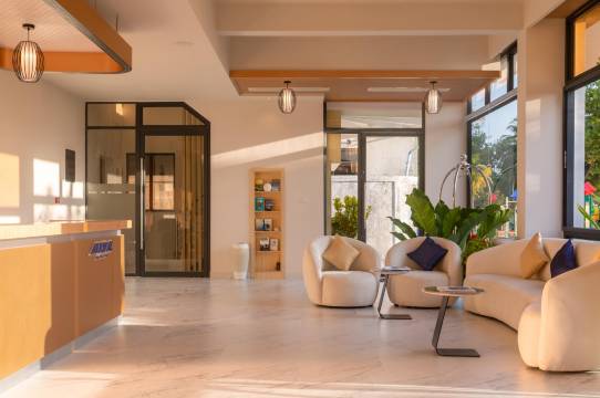 我们八月底在这里度假,天气非常好。从机场过来大概只花了30分钟。我们乘坐早班机抵达,通过安检后会看到很多酒店的接机柜台。我事先通过邮件确认了该去哪个柜台,但那里没有人。我们知道大概几点有船,所以就在等候区等待。临近早上8点,我们去了柜台,才出来一位工作人员。酒店最好能提前说明一下柜台早上不开放,这让我们有些小恐慌。或许酒店应该更换机场的接待人员,那样会很棒。我们被安排上了船,顺利抵达酒店。酒店内部的服务很周到,提供了毛巾和果汁来迎接我们。唯一一个贯穿整个旅程的缺点就是苍蝇,数量很多,需要做好心理准备。起初在餐饮方面有些小误会,但都解决了。由于我们提前退房,所以成功把最后一天的餐食提前享用了。岛上只有这里的泳池,帮了大忙,里面人很少。房间每天都打扫,供应充足,唯一没有的是肥皂,但这也不是什么大问题。