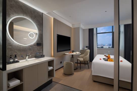 地理位置方便 旁边就是奥园广场和奥体球场,去哪都很方便;酒店服务周到,会介绍周边游乐去处和发一张酒店服务指南;房间布局合理,一眼就看得到地产建筑,房间干净无味,且全屋智能设备,用起来非常省心。好评。