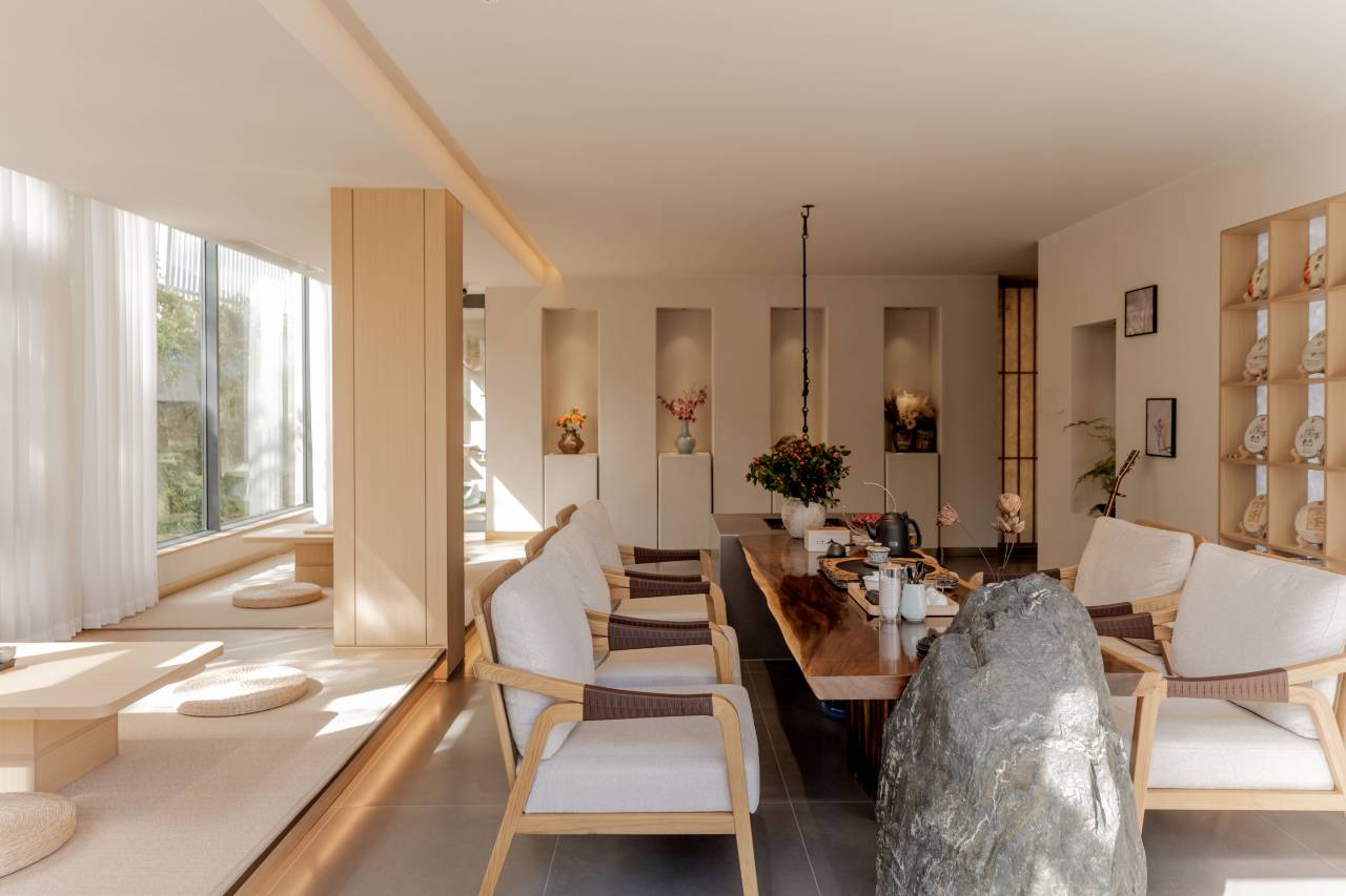 高冷的大壮总爱蜷缩在茶室的美人靠上,雪白的长毛和蓝眼睛像从画里走出来的。布丁则是活泼的"迎宾大使",见到客人就躺倒露肚皮,最喜欢追着落叶在院子里打滚。两只性格迥异的猫咪给庭院增添了无数生机。
