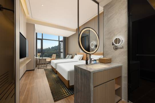 房间大小:够用。这次是刚需睡一晚,订了城景标双,房间不算大,但够用了。整个房间连卫浴约二十多平方。