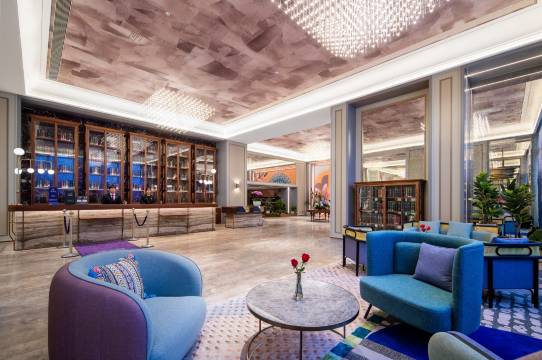 和妈妈一起旅行的, 美居的大堂很气派和洋气, 法式优雅简约风格, 房间里面的设计很喜欢, 颜色很素雅, 住进去很舒服。
