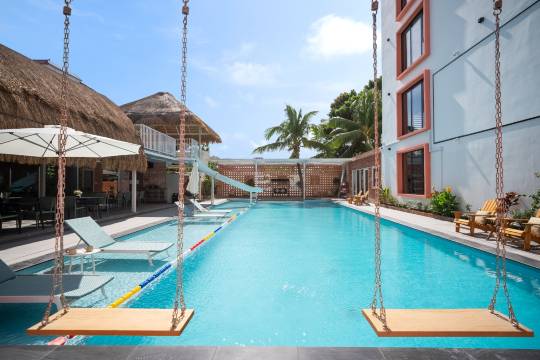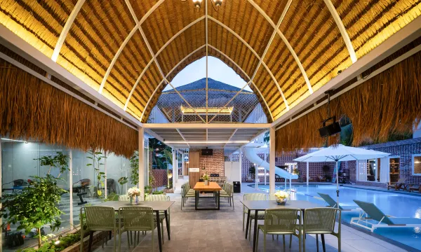 房间巨宽敞,两个床🛏️都舒服~民宿里蓝色泳池+滑梯,度假感爆棚,晚上还有大银幕,能看电影K歌,玩水撒欢两不误!