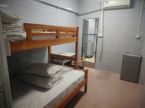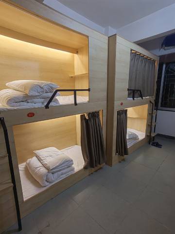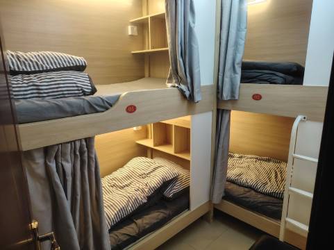 还可以,对得起这个价格,客厅也很大,有沙发,热水壶,木头的床,独立性很好,每个床都有灯,插座,帘子,床头有放东西的地方