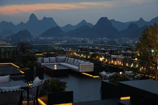 房间可以看到江、湖和象鼻山。酒店的员工小蒙、小施服务很专业和周到。在房间里,躺在床上、坐在沙发上各个位置都能见到美景。房间里设施都很新,z家具和装修风格很时尚。酒店餐厅外的大露台和17楼的观星吧能多角度观看桂林市区和周围山峰的景观。