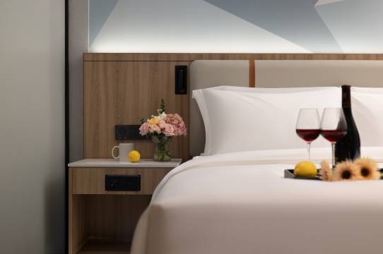 房间很大,床睡着很舒服,前台看我们有小朋友还专门加了牙刷和拖鞋,很热情,专门帮我们弄了爆米花和咖啡,让机器人送到房间,非常值得推荐的酒店。