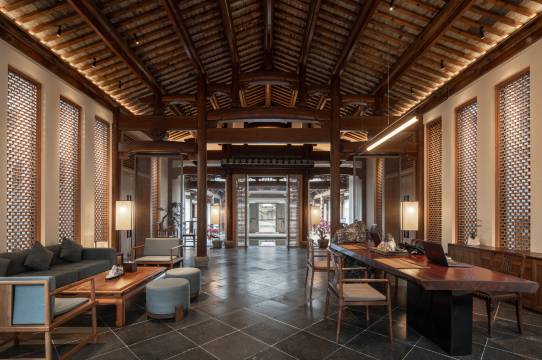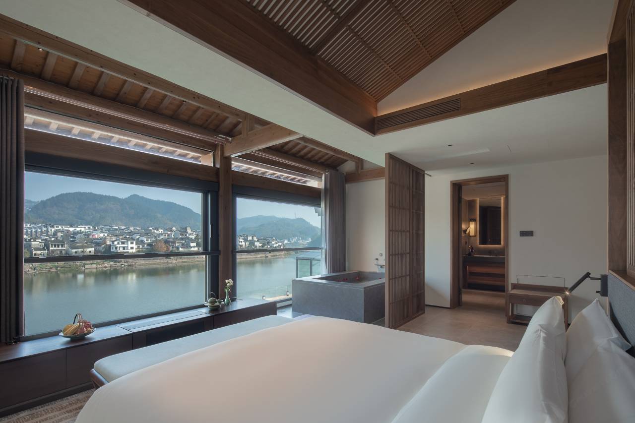 整个酒店就是个徽派建筑的大花园,临河而建,对岸就是渔梁坝村落区景色超美,空气清新,到徽州古城步行就到,房间设施高端,洗护用品也都是高档品牌,服务也好还升级了房间,非常满意!早餐的套餐精致可口,总之住着非常舒服,适合度假休闲的好去处