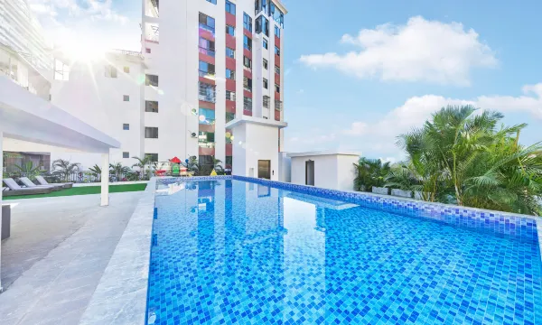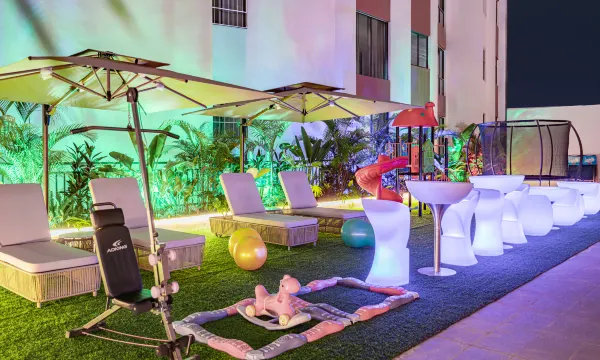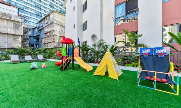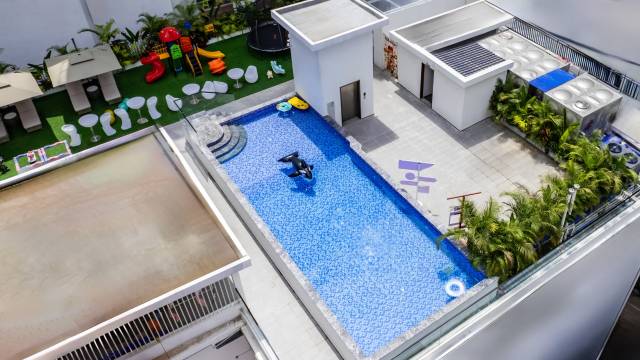 顶楼的游泳池更是一大亮点,池水清澈见底,畅游其中,仿佛所有的疲惫都被洗刷掉了。儿童乐园更是孩子们的欢乐天地,各种游乐设施丰富多样,孩子玩得不亦乐乎,家长也能放心地享受休闲时光。