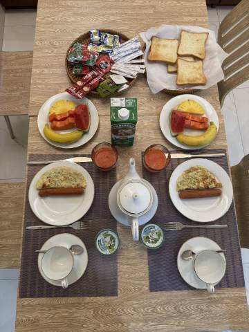 因为乘早班飞机,等我来到民宿还没到入住时间,发现主人不在,幸好接机的司机主动帮我们打电话联系,民宿主人马上开车赶来,给我们安排住宿,还问我们有什么安排,他可以帮我们。原来我对这间民宿抱着过渡一晚,随便订,没想到大大出乎我的意料,一栋非常有品味的别墅,有一个小院子,干净整洁,客人可以在厨房烹饪,因为时差,我们也早早睡了,主人不放心,特意发微信问我们回来没有,由于我们第二天要赶路,提出早餐提早到07:30开,没想到,第二天一大早,夫妻俩人弄了一座丰盛的早餐,让我俩有了回家的感觉,的确这是一家人情味,有家的温暖的民宿,值得一住。