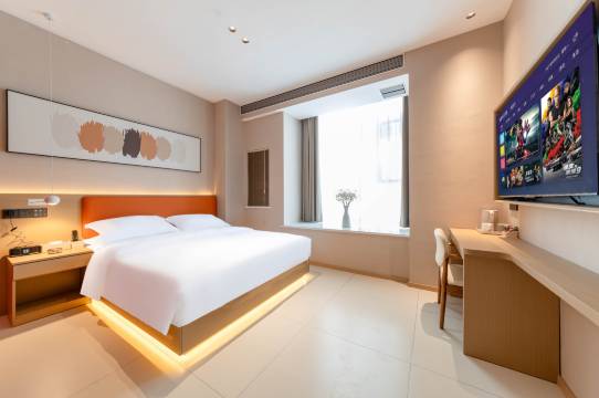 推门进去的瞬间旅途疲惫先消了一半,整屋的米白色调暖得刚刚好,连地毯都是踩上去软乎乎的短绒款,光脚走都没问题。落地窗擦得透亮,正午的阳光铺在靠窗的懒人沙发上,旁边小桌子还贴心放了免费的挂耳茶和矿泉水。连晾衣架都多配了五个,完全懂出差人临时要熨衬衫、洗贴身衣物的痛点。床单被罩摸上去是刚晒过的蓬松感,枕头分了软硬两款,躺下去完全陷进软乎乎的包裹感里,连我这种认床的人都一夜睡到大天亮。
