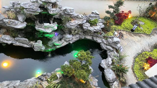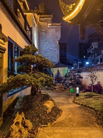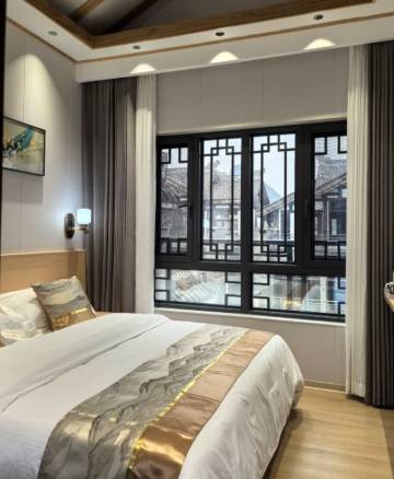 位置不错,离锦绣古镇和龙潭湿地公园很近,逛街和玩水都很方便,装修有苏式园林风格,亭台楼榭蛮别致的,很典雅。
