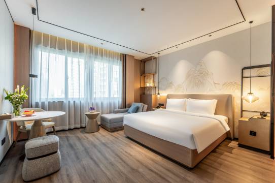 房间里的智能设施特别贴心,语音控制灯光、窗帘和空调太方便了,深度睡眠的床垫和枕头舒适度满分,躺上去很快就能放松,加上城市景观的视野,晚上看着窗外夜景特别惬意。房间的卫生也做得很到位,各个角落都干净整洁,用品摆放规整。