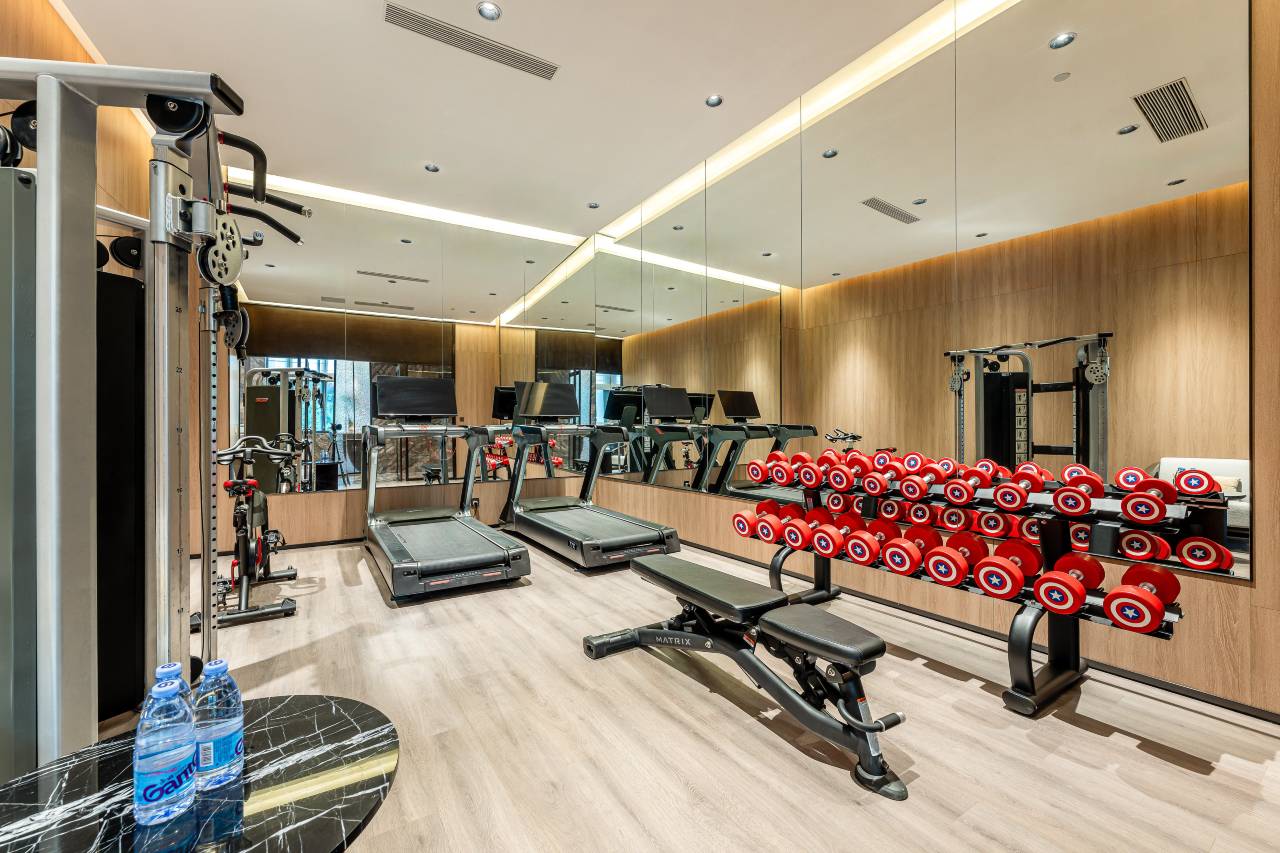 大厅摆件超绝,中式兽首、逼真木质建筑模型,处处透着精致高级,像逛艺术展,连健身区哑铃都做成美国队长盾牌样,创意满分。