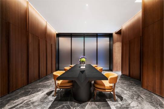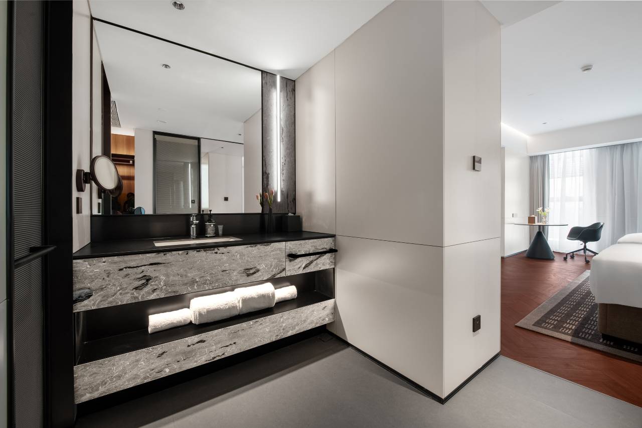 一进大堂就被利落的几何线条拿捏,玻璃与金属碰撞出冷冽高级感,没有多余装饰却处处是细节——前台的无衬线字体标识、走廊的模块化摆件,连墙面线条都透着德式精准美学。