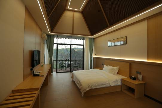 是山上一个茶厂开的,凉台外面就是茶山,有世外桃园的感觉。周边除了茶园应该是啥都没有,只能在店里吃,不过店里的饭不错,也不贵,鱼做的很合我口味。服务很周到,可以买点茶叶,性价比还是不错的。偶尔住两天装两天世外高人不错。房间内设施够用,不算好,门锁不太好,不过这地方用不上锁门