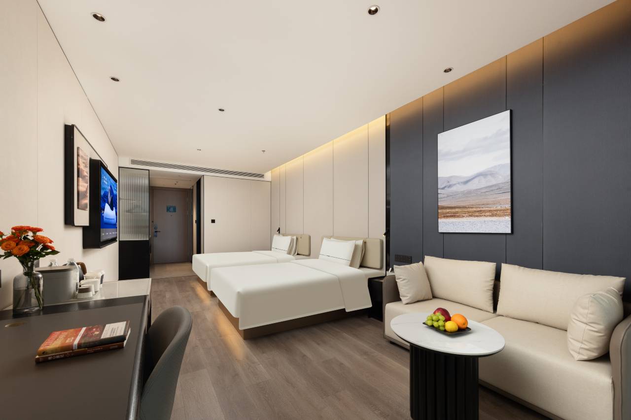房间非常干净整洁,前台小姐姐办入住很快,还倒了茶水,房间的设施设备很新,非常齐全,还有角度可以关电视关窗帘,非常不错,还有机器人可以送餐到房间,离店还给了热水很贴心。
