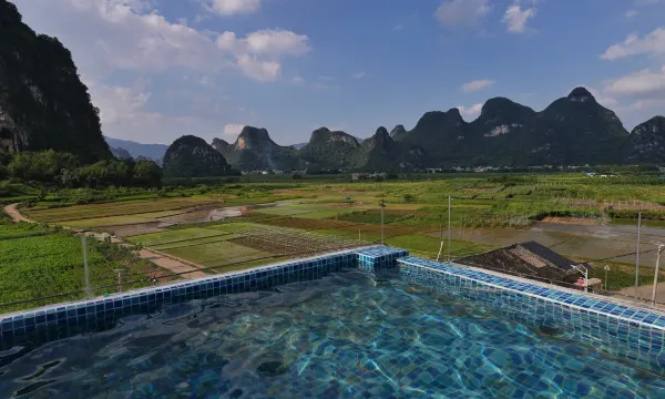 在峰林、田园怀抱中,沿溪流而建,位置景观相当好。 以打造星级的家为理念结合新旧两座庭院,故取名“禾愿里”又通“合院里”。旧四合院保留四、五十年的老泥砖房,冬暖夏凉,是酒店的动线部分。咖啡厅、中西餐厅、厨房,会议室、展厅都在这个区域。新合院共四层,又分前后部分。前面是复式结构,一,二楼为大堂书吧,茶室,儿童阅读游玩区。三楼亲子房,四楼公共阅读观景区,还有大泡池。后部分四合院结构全是房间。天井做了四水归堂的格局。雨天在房间听听雨也是一种享受。南向的房间都带独立阳台。合院的设计让人与人之间即有亲密关系又有距离感,是一种舒服的相处关系。 设计和装修上以家为理念,中色系的配色加当地竹编英石取材。外墙的灰泥颜色更是像把房子融入大自然中,旧四合院用黄色的稻草漆与周边旧瓦房相辅相成结为一体很是协调。入住体验方面,床垫床品按星级酒店标准配置,所有房间安装中央空调和热水系统,热水秒出,大大提高舒适度。窗户安装加厚中空玻璃,隔音效果很好。客人入住体验极佳。禾愿里开业以来接待游客得到大家的好评。我们一直努力中,尽力完善好酒店各项功能,让大家体验星级的家。 入住咱们酒店还可以体验攀岩和探洞的乐趣。