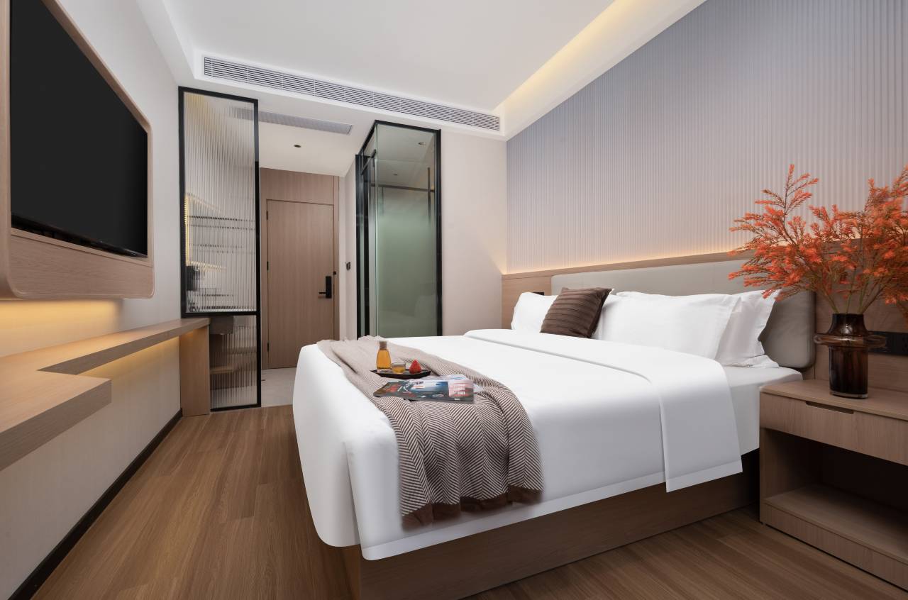 万象城店独特魅力踏入戴丁连锁酒店万象城店,前沿智能科技打造的便捷舒适体验扑面而来。房间门锁智能刷卡感应开门,灯光、窗帘与空调皆能通过智能系统随心调控,让每一位宾客仿若置身未来世界。客房内,高清投影设备带来震撼视觉盛宴。超大屏幕搭配优质音效,无论是观赏热门电影,还是进行商务演示,都能沉浸其中。躺在柔软的床上,就如同拥有私人影院。酒店引以为傲的 24 小时管家服务,随时响应宾客需求。无论是清晨急需提供帮助,还是深夜需要帮忙预订出租车,贴心管家都能迅速安排妥当,提供无微不至的关怀。酒店地理位置很好,雄踞万象城核心地带,周边潮流购物、特色美食一应俱全。无缝对接地铁站,轻松畅达城市各个角落。闲暇之余,邻近的公园是散步休闲的好去处,清新空气与自然美景令人心旷神怡。而附近的医院,更为宾客的健康提供坚实保障。选择戴丁连锁酒店万象城店,就是选择一场集智能、舒适、便捷于一体的难忘之旅 。