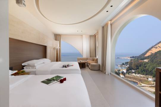 酒店地处半山中,安静舒适。房间面向大海,可惜天公不作美,两天都下大雨,无法欣赏日出、日落,稍有遗憾。酒店装修风格地中海风情漂亮,让人眼前一亮的,酒店新,干净整洁,老板服务细致周到,早餐简单美味。超赞。会推荐给亲朋好友,