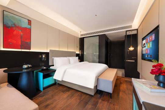 装修简约时尚 氛围感很好 房间无异味 新风效果不错 备品充足 灯光柔和 住着放松安心 服务周到有礼 体验感满分 下次继续选择!