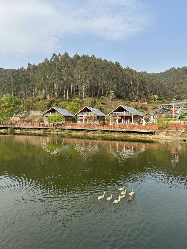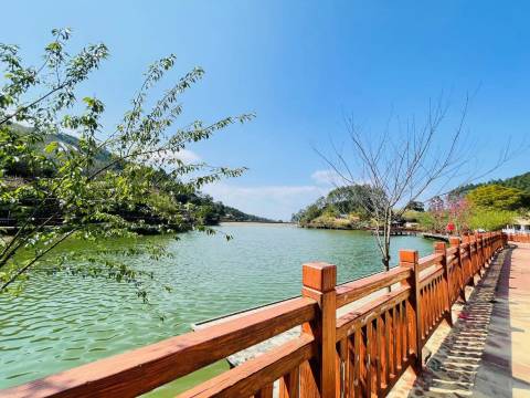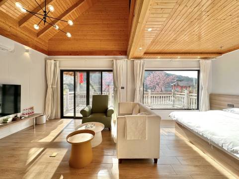 山间水库边的民宿,空气清新,樱花盛开,老板做农业生态旅游项目开发的,有小木屋别墅套房,客人不多。