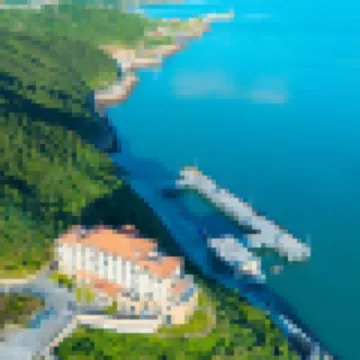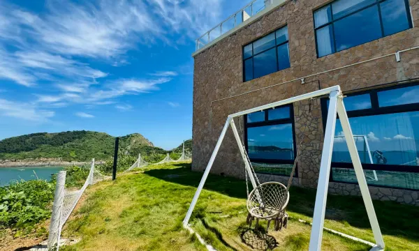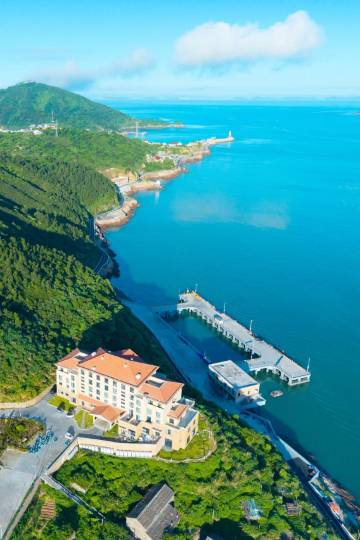 酒店座落于下大陈浪通门景区上面:码头抬头看半山坡与蔚蓝大海交接处:一座红色楼顶城堡巍然矗立:此地水天相接:烟波浩渺,水光山色清静怡人:景观甚是迷人:毗邻甲午岩景区和台胞二岸乡情:步行各十五分钟:一个能看日出日落的酒店。海景房180度直面大海上大陈岛风车:水光山色房可看浪通门海浪拍打礁石浪花朵朵和垦荒精神梯田枕海浪声而眠:山景庭院房可看郁郁葱葱的树木花草晨起听虫鸣的声音。