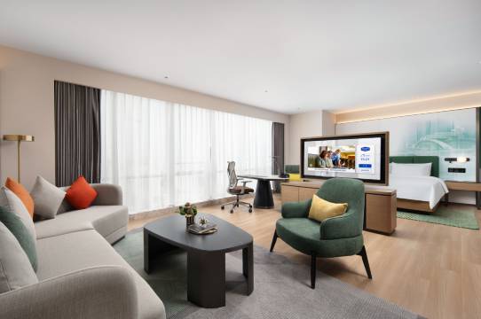 房间大小合适,设施标准,早餐适宜适当。周边购物、吃喝便利。惟二之憾点:一是建议房间小冰箱放两瓶水,茶吧放两瓶水,以便按需选用;二是茶几小桌边的地垫,与电脑椅发生冲突概率大,建议设法调整。
