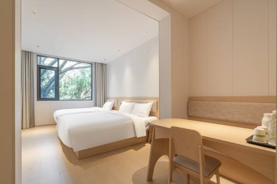 房间很干净,周围环境很好,很安静,服务也很好,设施很新。机器人送外卖上门。住得很舒服!交通也很便利,离沈园很近,步行5分钟即到。离鲁迅故里稍远一点,步行10来分钟也可以到了。