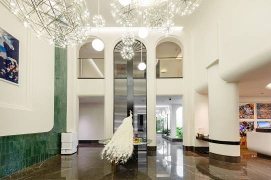 酒店外观是法式建筑风格,白色的独栋别墅搭配满满的绿植,一进门就仿佛来到了巴厘岛~大堂里还有珍稀的孔雀标本,每一处细节都彰显着精致与奢华。