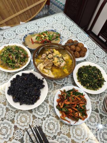 我们因交通限行被堵在路上,老板的父亲特意开车几公里来接。得知我需要准备第二天返程的食物,女儿主动骑电瓶车带我去村里采购,还坚持在清晨五点半起床为我们煮面——就连面里的青菜,都是天未亮时从田里现摘的。