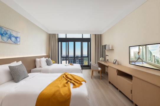 酒店周边交通网络纵横交错,紧邻地铁6号线香雪站,驱车即可轻松抵达新塘高铁站,无缝衔接城市脉络;无论是商务差旅还是尽情探索广州的城市魅力,皆能快速抵达,尽享便捷无忧的出行体验。 在休闲娱乐与生活配套方面,酒店周边环绕着创新公园、香雪公园等自然生态之境,让您在繁华都市中亦能畅享清新绿意与宁静闲适;萝岗奥园广场、星际云汇、飞晟汇等多个知名购物中心较近,满足您多样化的消费需求,让乐活生活触手可及。 公寓酒店共提供多套简约舒适的客房,从单房公寓到豪华单房公寓,满足您不同的居住需求。所有客房均设有独立的景观阳台和景观窗,独立宽敞的淋浴空间、完善的现代化家电等,让您尽享高品质的馨乐庭生活。 公寓内配备高速无线网络、商务会议室及多功能室,为您提供全方位的商务支持。景观开阔的早餐厅为您提供当日新鲜、品种丰盛的颐人早餐;公寓同时也致力于打造年轻活力的生活方式,住客可在设备完善的健身房、瑜伽室、乒乓球室尽情挥洒汗水,享受运动欢愉。