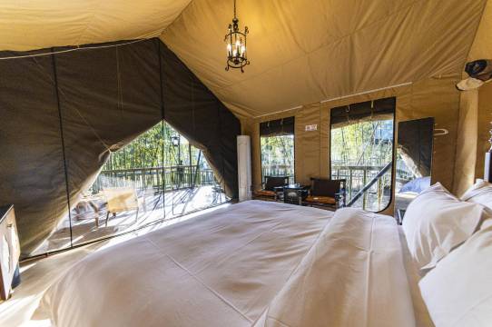 和朋友一家一起去的,他们住的帐篷带温泉房,我们住的别墅房因为宝宝小怕住帐篷房竹林有蚊子