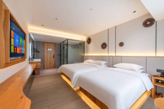 酒店前面有停车场,前台阿洋免费给我们升级房型。房间里面智能家居,小度给力,房间空间大,舒适度可以,卫生间与淋浴间、洗手台干湿分离,自动窗帘,客房服务很周到,今天去的时候还是满房,说明大众认可度还行,开年刚刚装修完的新酒店,优惠力度也大,旁边有个