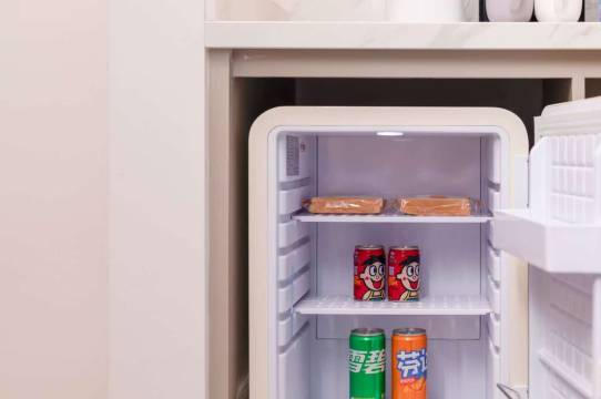 这次住了两个房型,大床房和双床房,房间都挺大的,特别是双床,比一些连锁的都大一点。卫生间和浴室是分开的,大床房的是并在一起只做了干湿分离。双床房的镜子和洗手台也很宽很大,双床房还有个全身镜。两个房型都有智能客控和小冰箱,冰箱里有入住饮料可以免费喝。就是两个房间的墙壁都有点花,大床房床旁边的单人椅下有点小灰尘垃圾,一次性洗漱用品上有点水痕和灰尘,吹风机也有点脏:双人床靠浴室的那个床有个插座掉了(能用多少会掉出来,这个我个人觉得在房客入住前就解决掉更好)。退房行李寄存酒店有个小房间单独储存,也比较安全。