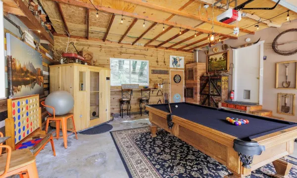 这个空间的真正特别之处在于它与户外的无缝连接。宽大的车库门可以卷开,让新鲜的山间空气吹进来,让您在阴雨天或小雪天都能享受舒适的环境,同时欣赏美景。无论是欢聚一堂享受充满活力的游戏之夜,还是享受桑拿的温暖,亦或只是沉浸在宁静的环境中,无论什么季节,这个车库都能变成一个迷人的休闲娱乐中心。