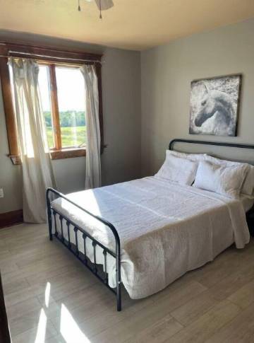 四卧室房屋,2.5 间卫生间。主卧室有一张特大号床和连接的主卫生间。另外 3 间卧室有双人床,共用楼上的卫生间。楼下有半卫生间。您还可以使用带跑步机和狗门的大型洗衣房,狗门通向带围栏的院子。客厅配有电视和折叠沙发床。房子还有一个正式的餐厅。外面有一个谷仓和 80 英亩的树林可供探索。坐落在一条安静的死胡同上。
