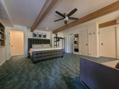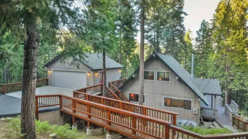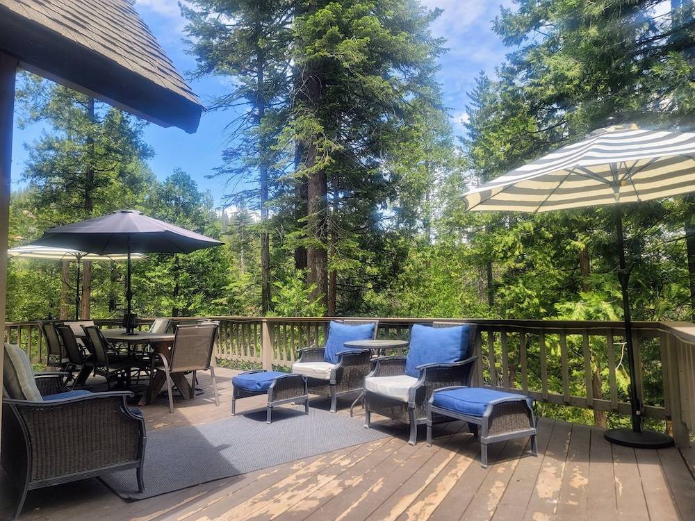 客厅拥有一整面落地窗,自然光线充足,还能欣赏到壮丽的内华达山脉松林美景。仿佛将室外美景引入室内。在凉爽的夜晚,您可以点燃温暖的壁炉,享受山间夜晚的惬意!这里是您在宛如世外桃源般的度假胜地放松身心的完美之选!