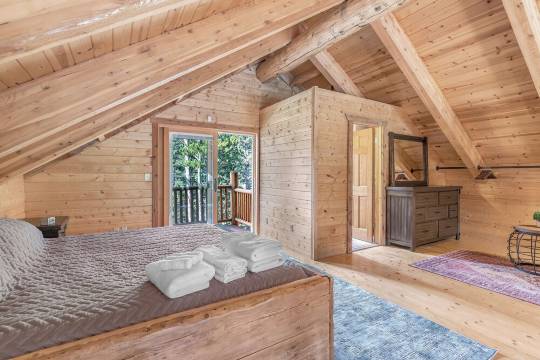屋内,舒适与山间优雅完美融合,设有三间卧室、三间浴室、两个独立的起居空间以及设备齐全的厨房,让您尽享悠闲的早晨和丰盛的晚餐。宽敞的落地窗几乎可以从各个角度欣赏湖景,将室外美景引入室内。
