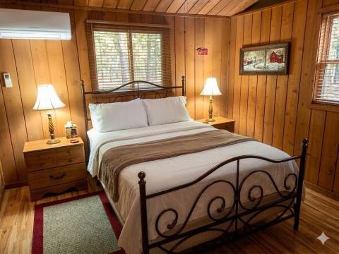 主起居室拥有雪松木板墙和拱形天花板,配备燃气壁炉、智能电视和设备齐全的厨房,可直接通往俯瞰湖泊的带顶门廊。